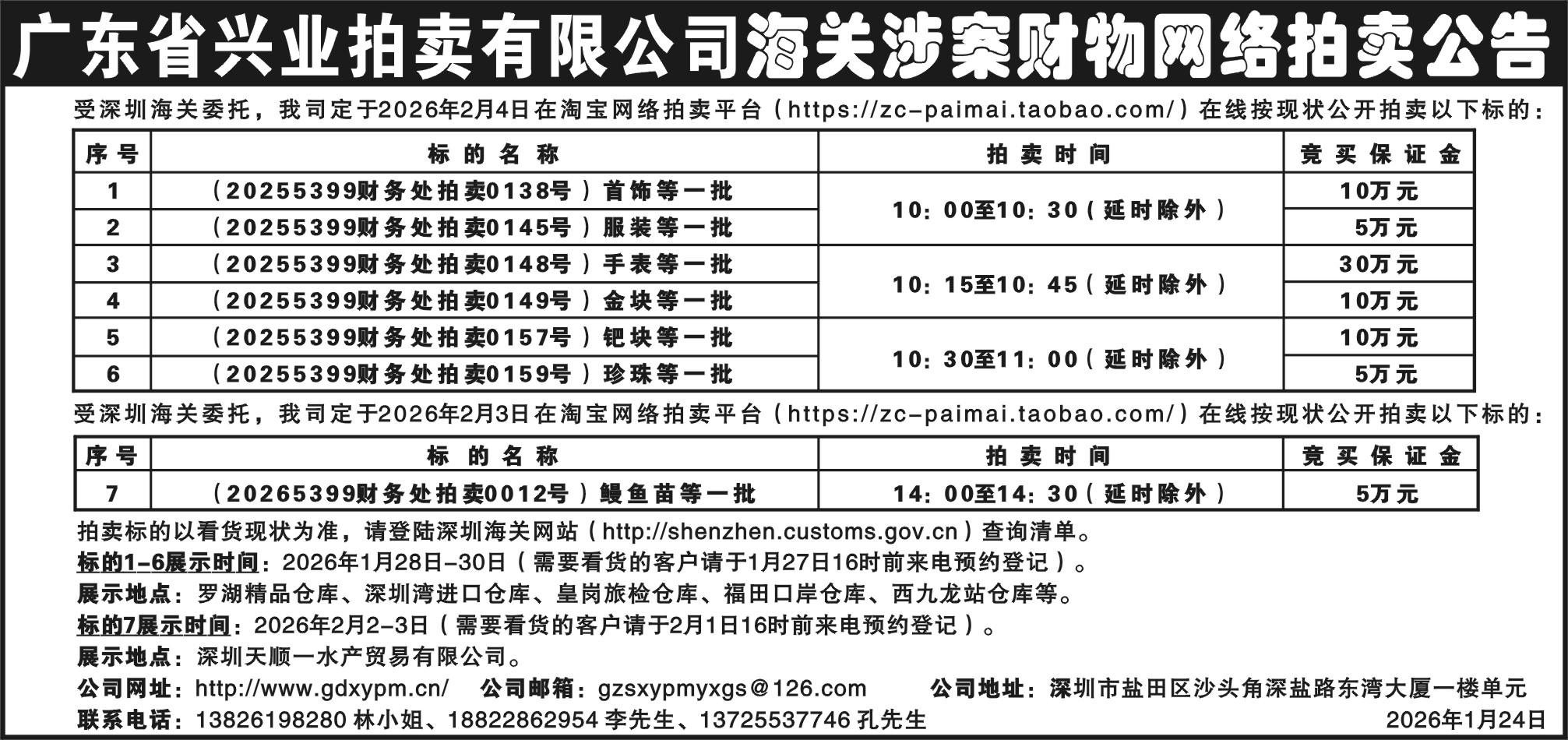 2026年广东省兴业拍卖有限公司深圳海关罚没物资拍卖公告